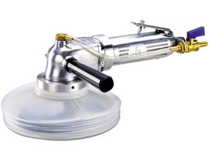 GPW-933A is a heavy duty air polisher most used for wet surface polishing of stone and concrete. The soft plastic shroud can prevent water from splashing all over. Maximum Pad Size : 5" Spindle Thread : 5/8"-11 Max Speed : 4,200 rpm Length : 330 mm N.W. : 2.64 kgs (6 lbs) Water Pipe : 8 mm (I.D.) (Plastic) Air Cons : 0.64 m3/min Air Inlet : 1/4" Hose Size : 6.5 mm (I.D.) Sound Pressure : 88 dBA Vibration : <2.5 m/sec2