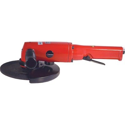 VT3107 Features: -Grinder. -Includes guard, hex wrenches and spanner. -Safety throttle lever to prevent accidental start-ups. -Contoured variable throttle lever permits feather - edging to full-speed grinding. -Includes adjustable safety guard and side handle for left or right hand operation. -Front exhaust keeps working area clear. -Unique motor controller that virtually eliminates over speeding. -Precision gearing (bevel / pin) for long life and smooth operation. -Precision ball bearing construction for long life and performance. -7000 RPM. -9 CFM@100PSI. -1 HP. -Air inlet: 3/8'' NPT.